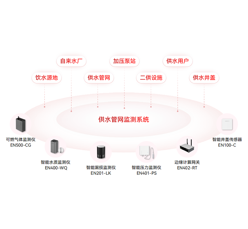 對供水管網設施及水質提供實時監測,通過各類智能監測終端保障供水壓力平衡、流量穩定和供水安全,及時發現爆管并預警,避免大面積城市停水事故發生,為管網爆管預警分析、用水趨勢分析和泄漏量預警分析提供數據支撐。